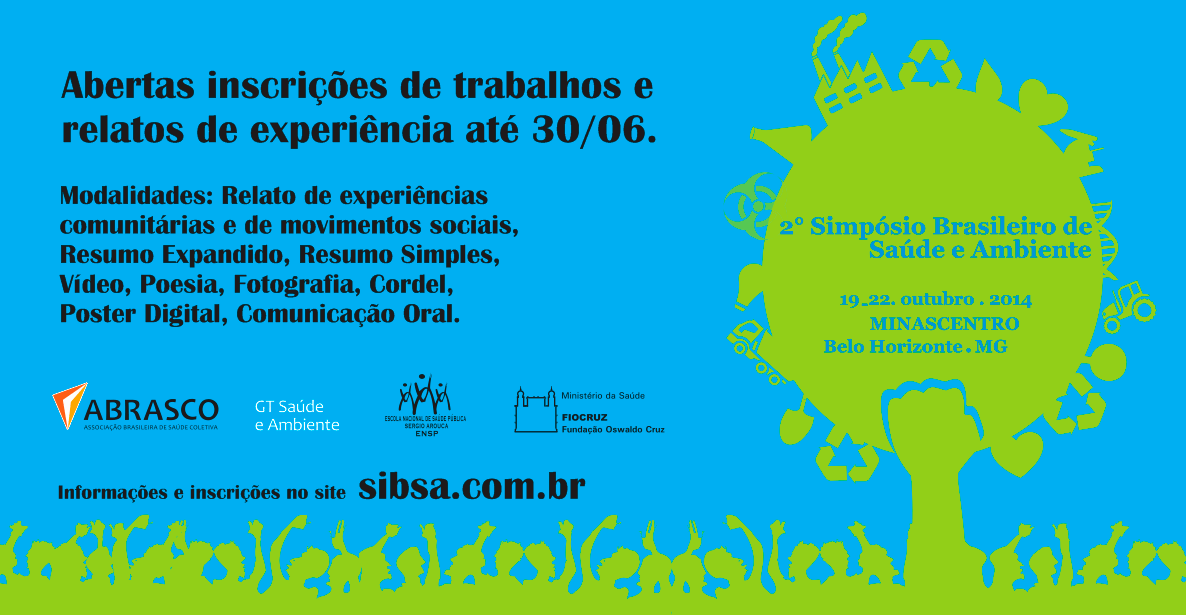 O GT de Saúde & Ambiente da ABRASCO irá realizar no período de 19 a 22 de outubro de 2014, na cidade de Belo Horizonte/MG, o 2º Simpósio Brasileiro de Saúde & Ambiente (2ºSIBSA). O tema central deste simpósio seráDesenvolvimento, Conflitos Territoriais e Saúde: Ciência e Movimentos Sociais para a Justiça Ambiental nas Políticas Públicas, que para efeito da realização das atividades foi divido em três eixos: Desenvolvimento Socioeconômico e conflitos territoriais; A função social da ciência, ecologia de saberes, e outras experiências de produção compartilhada de conhecimento; Direitos, justiça ambiental e políticas públicas.