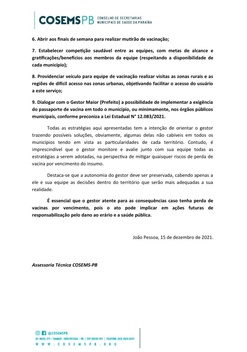 O Cosems Paraíba publicou nesta quarta-feira (15), uma Nota Orientativa sobre o alcance de metas na vacinação contra a Covid-19 nos municípios da Paraíba.
